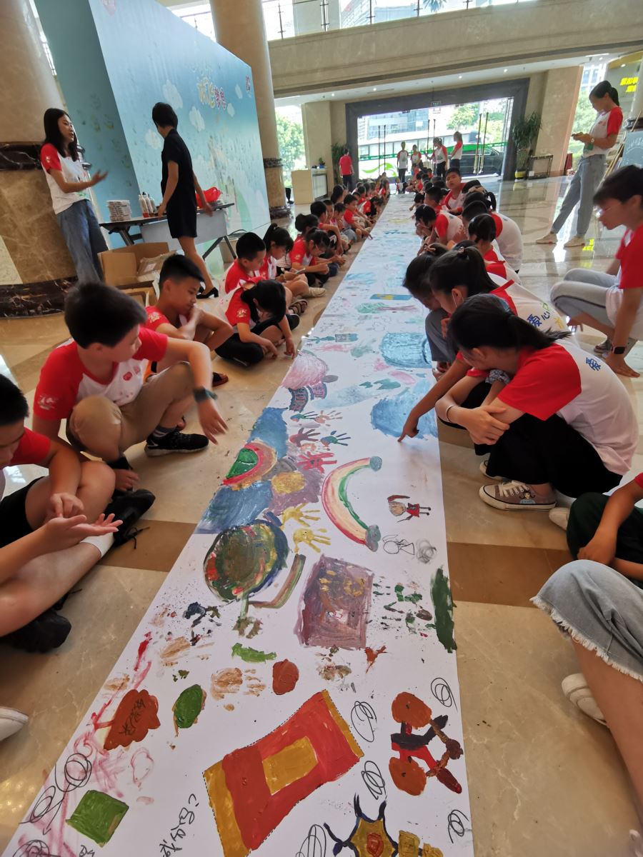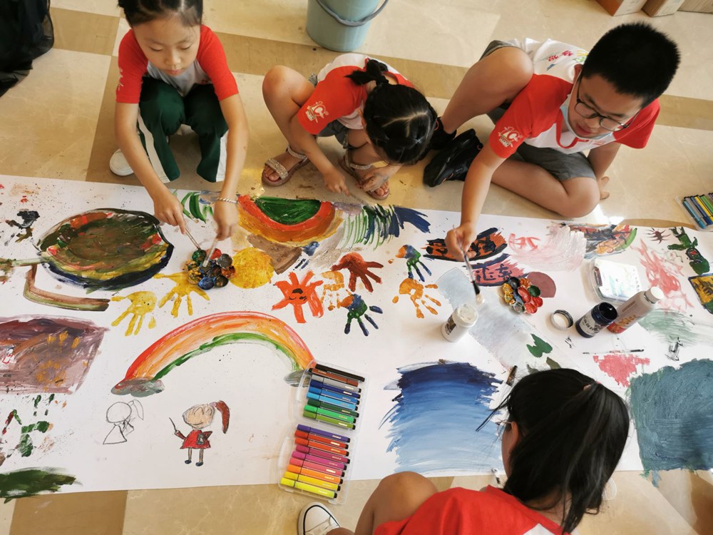 只見他們有的充分發揮著自己的創造力,化身“小畢加索”,在畫布上無拘無束地釋放自己的藝術靈感;有的仔細觀察窗外的晴空和艷陽,一筆一畫細心創作;過程中,孩子們互幫互助,幫著調顏料、涂色彩,合力完成這“夢的長卷”。